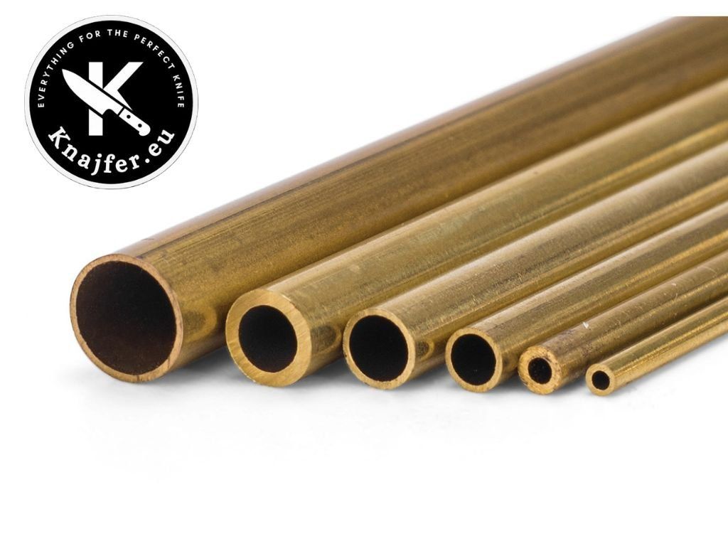 Messingrohr für Messergriffe. Die erste Zahl der Abmessung gibt den Außendurchmesser, die zweite den Innendurchmesser an. Die Länge des Rohrs beträgt 330 mm.